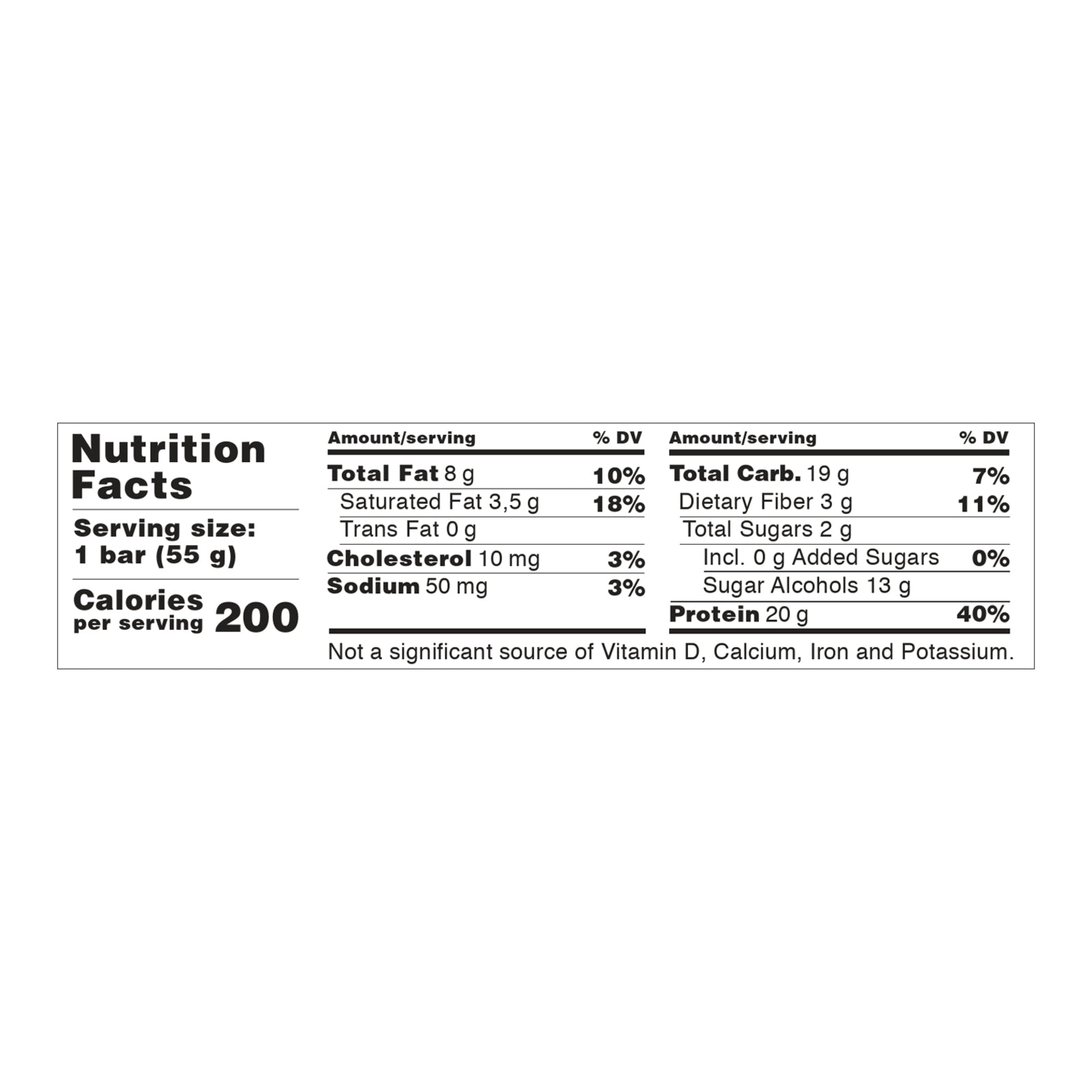 Artificial and natural flavoring. 20 grams of protein. No added sugar. See nutrition facts for sugar, calorie and saturated fat content. Not a low or reduced calorie food. www.barebells.com.