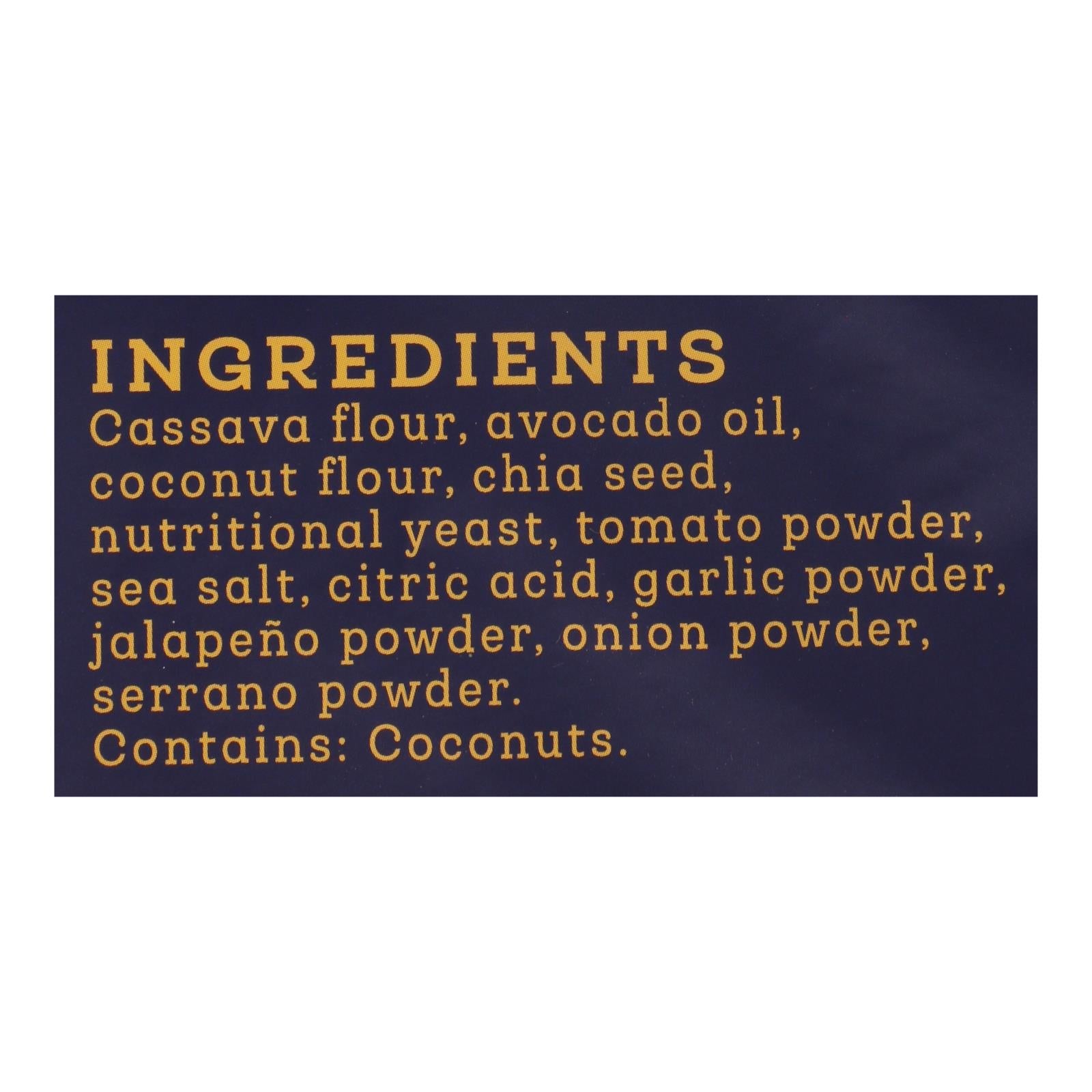 Delight in the bold and spicy taste of grain-free nacho tortilla chips that are crafted with care for those who crave flavor without compromising on quality. These chips are not only gluten-free and non-GMO, but they also boast a wholesome ingredient list that includes coconut flour, ground chia seeds, and cassava flour. Perfectly seasoned with tomato, jalapeno, toasted onion, and garlic powders, they offer a punch of flavor in every bite.