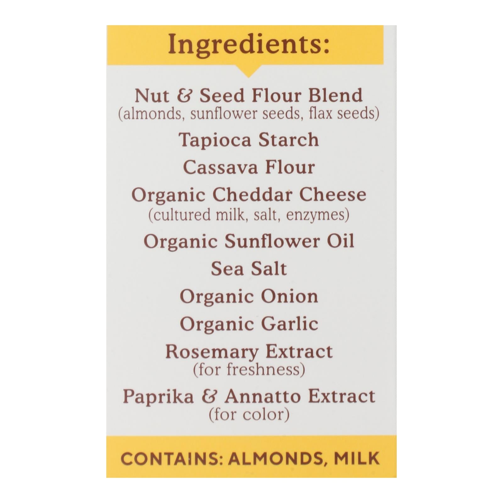 Delight in the rich, savory taste of these farmhouse cheddar almond flour crackers, a perfect snack for any occasion. Made with a wholesome blend of nut and seed flours, these crunchy bites offer a delightful combination of organic cheddar cheese, sunflower oil, and a hint of rosemary. Each 4.25 oz. box is packed with flavor, providing a satisfying snack option without compromising on nutrition.